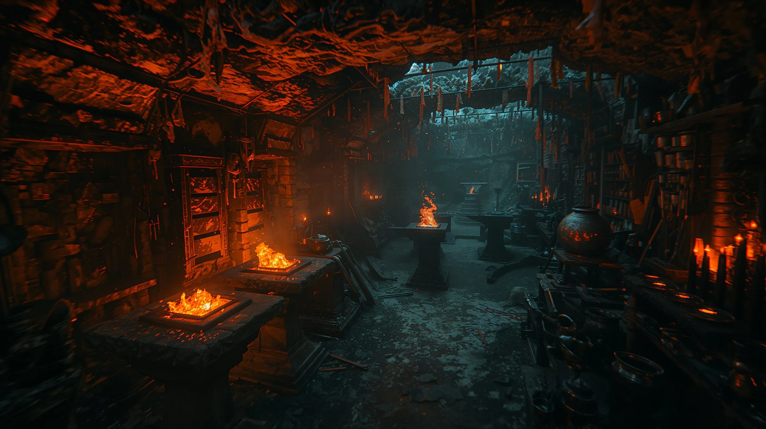 fire-opal jewelry • obsidian blade pendants • UV tattoos and beadsThis sanctum wears intimidation like jewelry.